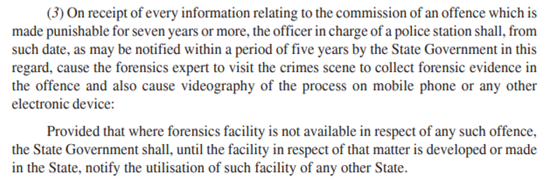 The new addition makes visit and investigation by the Forensics team/Crime at the scene of crime mandatory in cases punishable with greater than 7 years imprisonment.