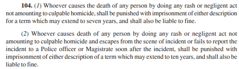1.3. Death by Rash and Negligent Acts may now warrant punishment of upto 7 years and, in cases of hit-and-run, even 10 years.